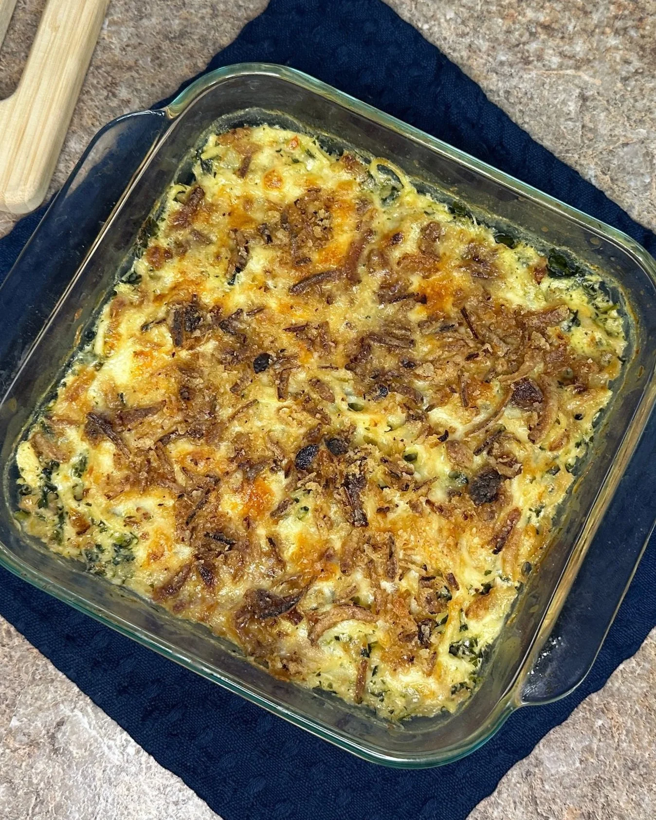 Combine the following in a large bowl: sour cream, cream of chicken, milk, cream cheese, drained spinach (be sure to give it a good squeeze to get all the liquid out), 1 cup of monterey jack cheese, ricotta cheese, parmesan cheese, minced garlic, and 3 oz of french fried onions. Mix in any other optional add-ins at this time.